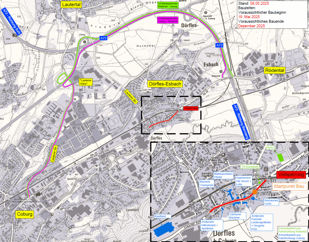 Am Montag, den 19. Mai 2025, ist es soweit! Die Vollsperrung der Ortsdurchfahrt durch Dörfles-Esbach auf der „Neustadter Straße“ (Kreisstraße CO 29) tritt in Kraft. Damit wird die Umleitung über die Autobahn 73 sowie über die „Lauterer Höhe“ und die „Lauterer Straße“ im Coburger Stadtgebiet relevant.