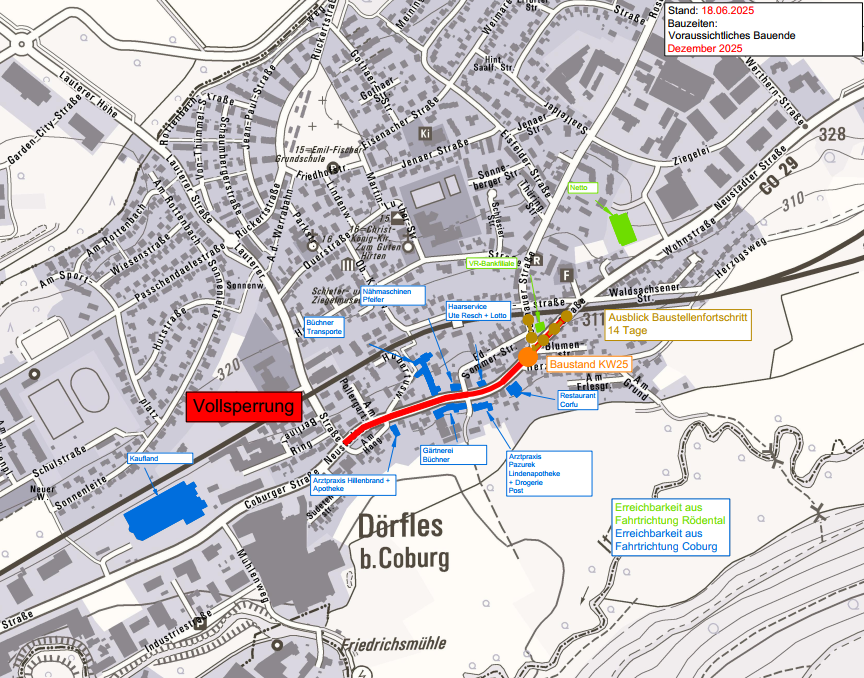 Die überörtliche Umleitung ist selbstverständlich weiterhin aktiv, wird aber nicht mehr auf dem Plan dargestellt – dies dient der Übersichtlichkeit. Die Umleitung sollte mittlerweile hinlänglich bekannt sein. Alle, die sich in Dörfles-Esbach noch Ausweichrouten suchen, wählen diese Wege entweder bewusst oder fahren gedankenlos nach Navigationssystem. Letztgenannten ist leider schwer beizukommen, insbesondere wenn Verbotszeichen (geflissentlich) ignoriert werden. Dennoch: Die Polizei zeigt sich sehr präsent, und es wurden bereits einige Ahndungen vollzogen. Ein 24/7-Polizeiservice nur für diese Baustelle und Umfahrungen kann natürlich nicht erwartet werden.