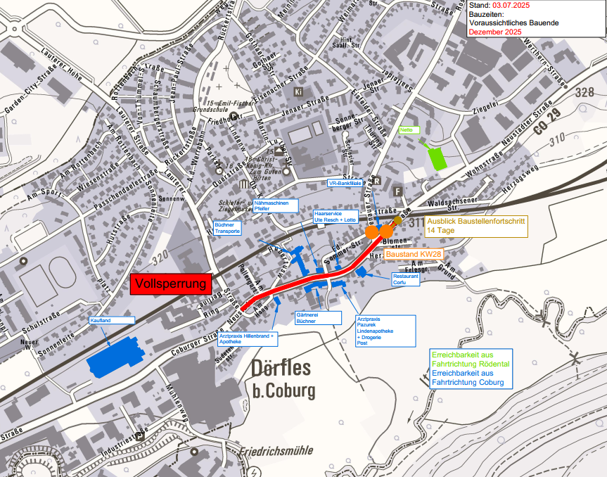 An der Ortsstraße Herzogsweg wird voraussichtlich ab dem 14.07.2025 wieder angesetzt, sodass die Baustelle Richtung Coburg fortgeführt wird. Eine bessere Abschätzung, ob das wie vorgesehen tatsächlich umgesetzt werden kann, wird die nächste Woche zeigen. Es stellt sich dann auch die Frage, wie in die Blumenstraße und den Herzogsweg eingefahren werden kann. Näheres dazu folgt im Update kommende Woche.