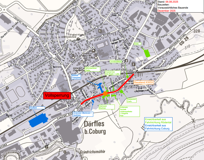 Da die Baustelle mittlerweile weit fortgeschritten ist, können viele Grundstücke nur noch aus Fahrtrichtung Rödental angefahren werden. Bitte nutzen Sie daher die Umleitungsstrecke aus östlicher Richtung (BAB 73 bzw. aus Rödental).