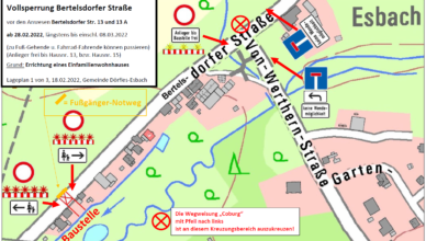 Ortsdurchfahrt D-E „Neustadter Str.“ voll gesperrt. Baustellen-Telefon: 09561 2333-250